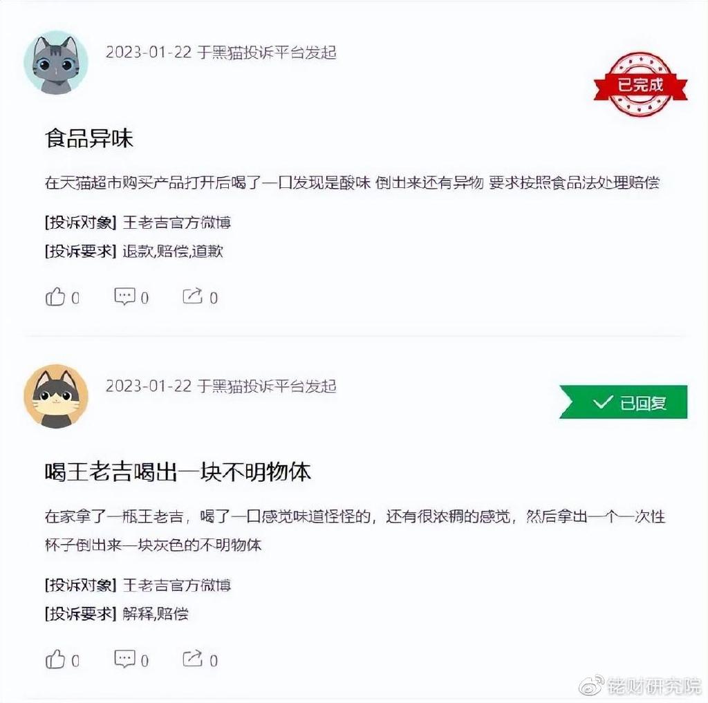 除了新品口感包装,浏览黑猫投诉[投诉入口],亦有用户投诉在天猫超市购买王老吉后,喝了一口竟然是酸味,倒出来还有异物。