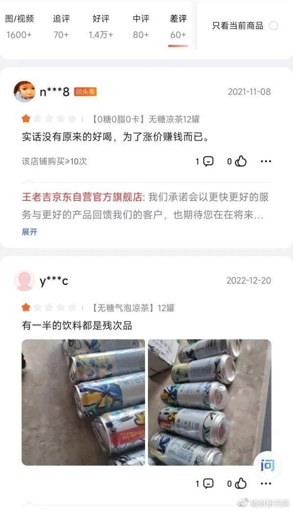 浏览王老吉京东自营官方旗舰店评价区,对新品有消费者留言:“实话实说没有原来的好喝,为了涨价赚钱而已。”也有消费者称,自己买到产品有一半是残次品。