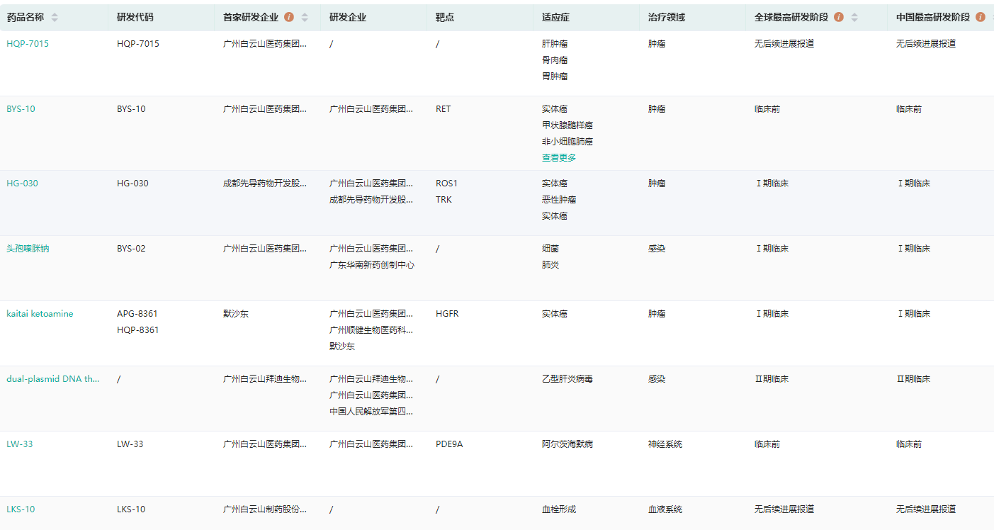 药融云全球药物研发数据库显示,目前,白云山的在研创新药项目有15个,覆盖肿瘤、感染、血液系统、心血管系统、神经系统、呼吸系统、泌尿生殖系统等治疗领域。其中,BY-S10已处于II期临床阶段;HG-030、头孢嗪脒钠(BYS-02)等药品处于I期临床阶段。