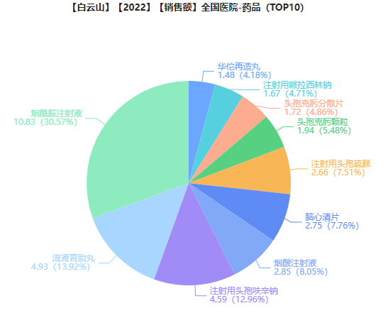 白云山的药品涉及内科用药、抗微生物药、男性用药以及镇痛、解热、抗风湿、抗痛风药等多个治疗领域。药融云数据库显示,白云山2022年在全国医院市场的销售规模达到51.63亿元,其中医院端销售额排名前十的药品分别是:烟酰胺注射液、滋肾育胎丸、注射用头孢呋辛钠、烟酸注射液、脑心清片、注射用头孢硫脒、头孢克肟颗粒、头孢克肟分散片、注射用哌拉西林钠、华佗再造丸。