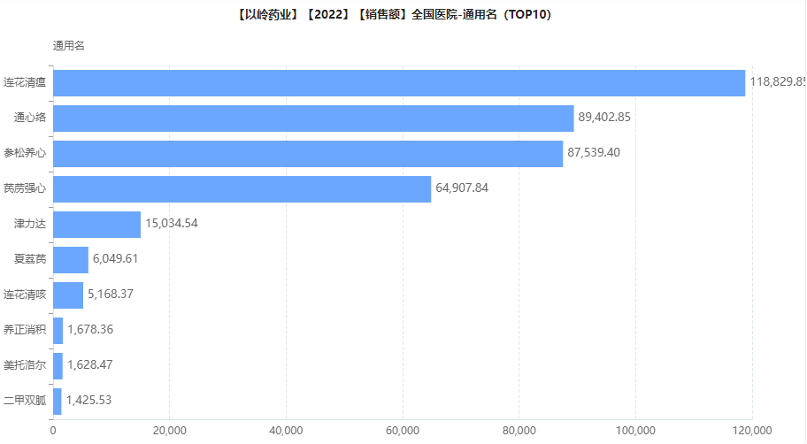 药融云全国医院销售数据库显示,以岭药业2022年在全国医院市场的销售规模达到39.27亿元,同比增长22%;其中,销售额排名前十的药品(按通用名进行排序)分别是:连花清瘟、通心络、参松养心、芪苈强心、津力达、夏荔芪、连花清咳、养正消积、美托洛尔、二甲双胍。