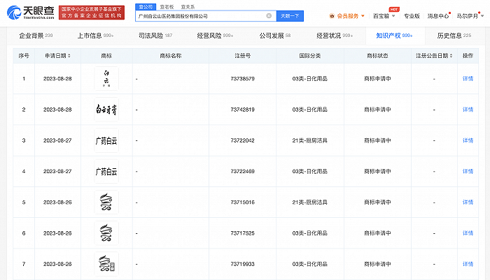 信息显示,近日,白云山已申请注册多个“白云牙膏”“广药白云”文字及图形商标,国际分类均为日化用品、厨房洁具,当前商标状态均为申请中。