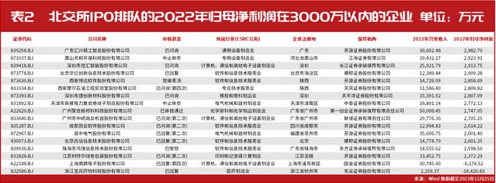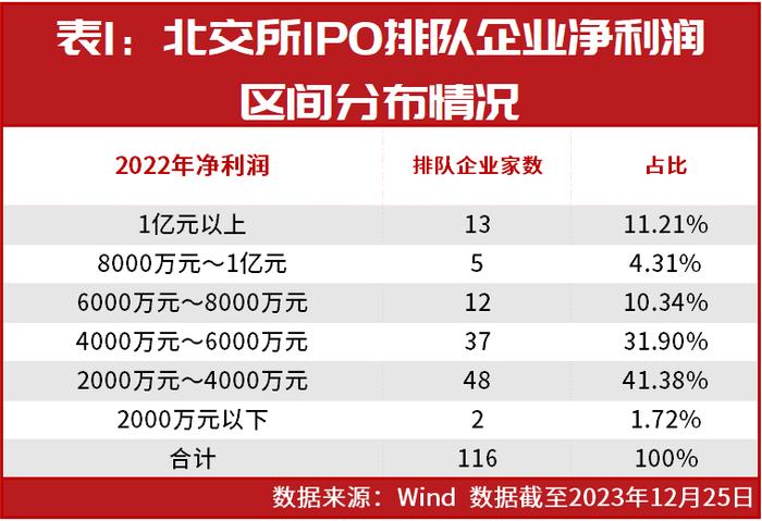 据Wind统计,截至12月25日,共有116家企业正在北交所上市审核排队中,IPO排队企业2022年的净利润大多分布在2000万元~6000万元之间,其中,净利润在2000万元~4000万元之间的企业共有48家,占比为41.38%;净利润在4000万元~6000万元之间的企业共有37家,占比为31.90%(详见表1)。