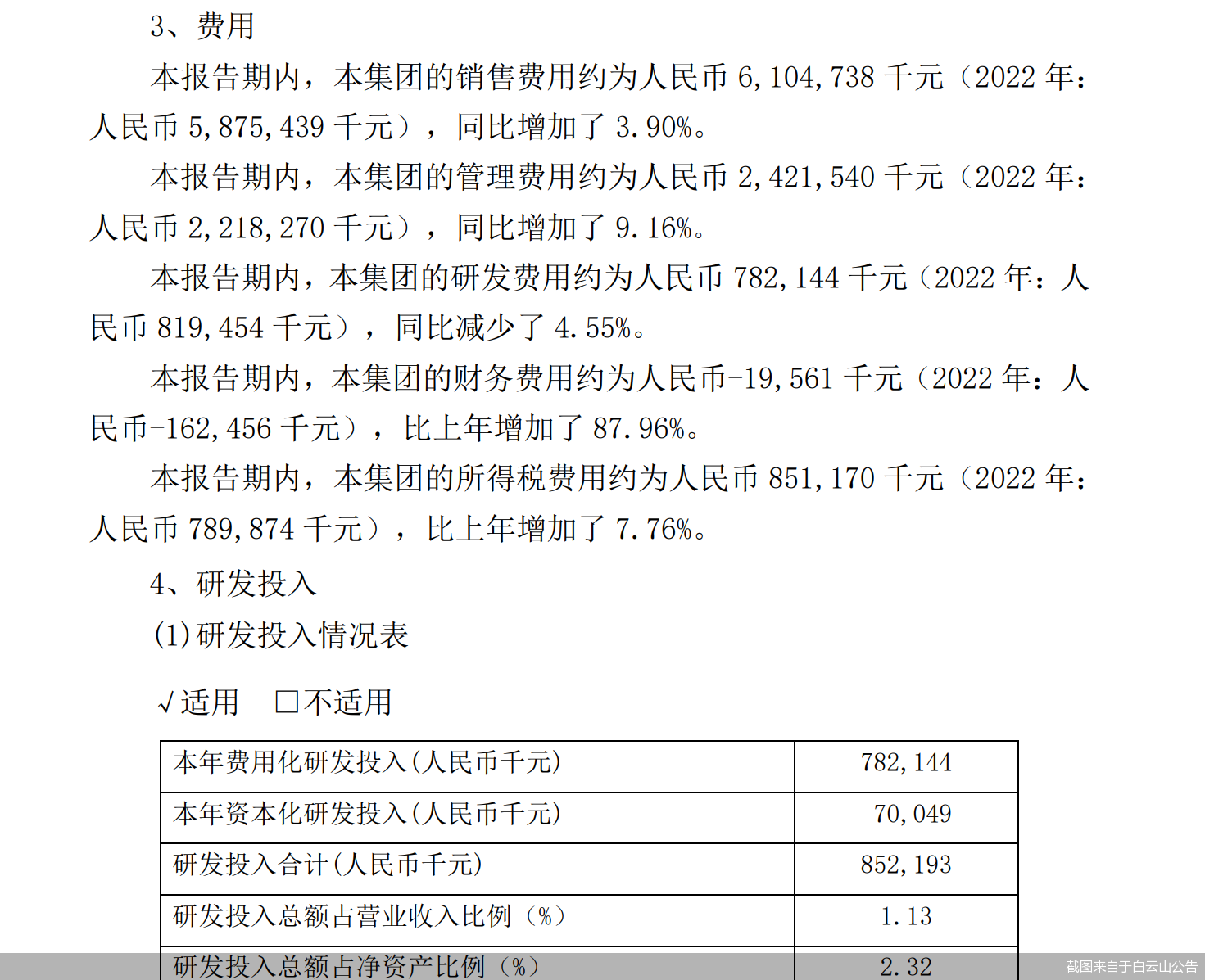 期间费用方面,2023年,白云山销售费用最高,为61.05亿元,同比增长3.9%。管理费用、财务费用分别为24.22亿元、-1956.1万元。