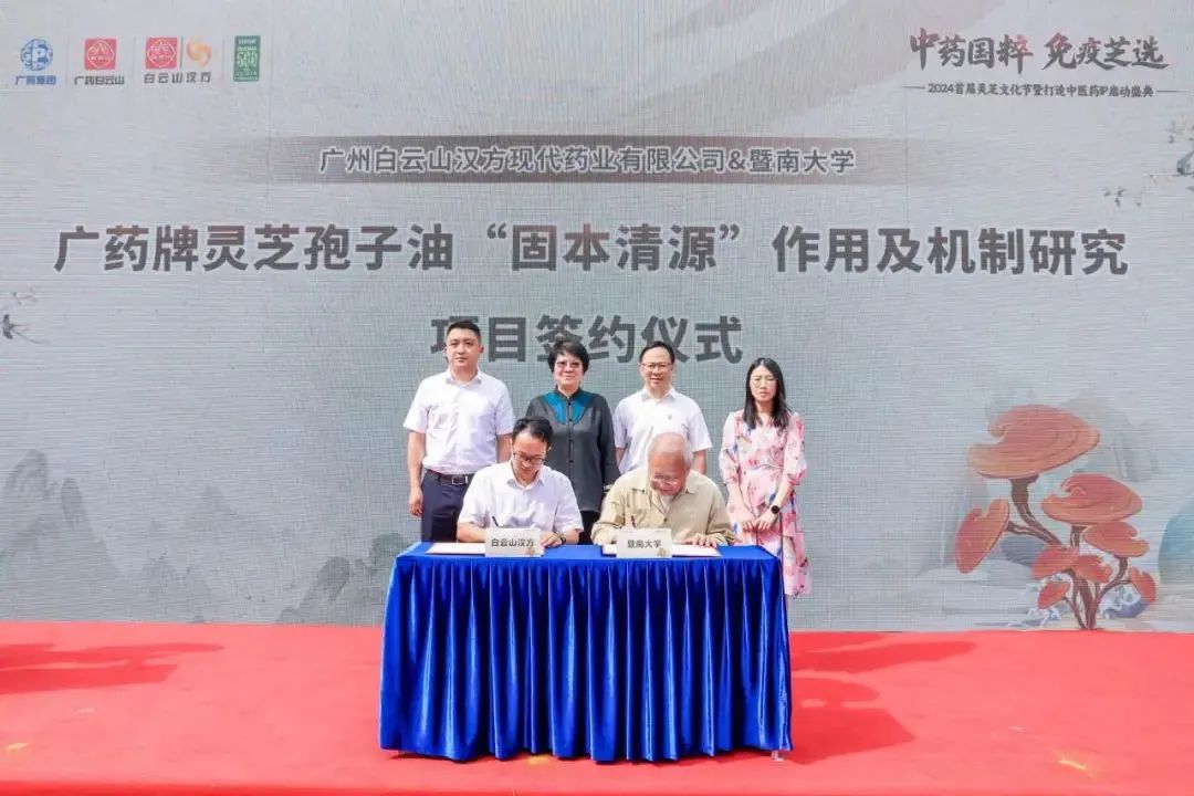 近日,2024首届灵芝文化节暨打造中医药IP启动盛典在广州神农草堂中医药博物馆隆重举行,广药集团副总经理、总工程师刘菊妍,白云山汉方董事长袁诚,总经理韩亚明,副总经理、国家工程研究中心副主任许文东,暨南大学教授、博士生研究生导师,暨南大学中药及天然药物研究所副所长栗原博出席盛典,并进行广药牌灵芝孢子油“固本清源”作用及机制研究项目签约,该项目聚焦广药牌灵芝孢子油协同化疗药物防治肿瘤的作用机制展开研究。