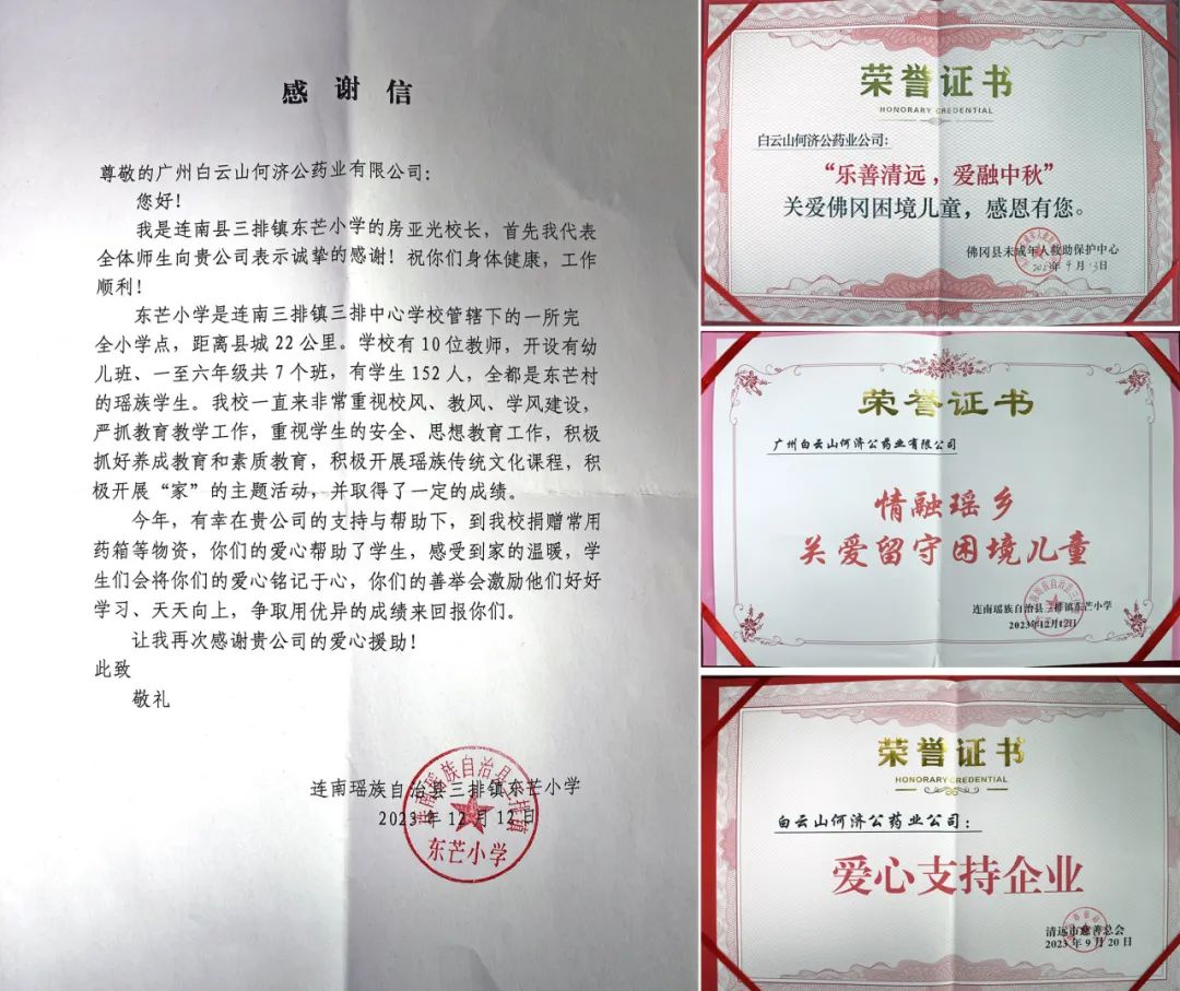 一封封感谢信与荣誉证书,记录着社会各界对白云山何济公多次为困境儿童献爱心的肯定与好评