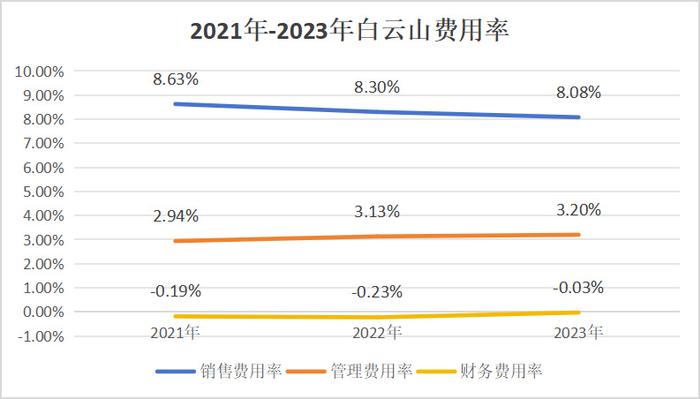 费用端方面,从2021年至2023年,尽管白云山的整体费用率出现下滑,但基本上变化不大,对净利率影响有限,并且费用率的减少反而是促进净利率增长的。