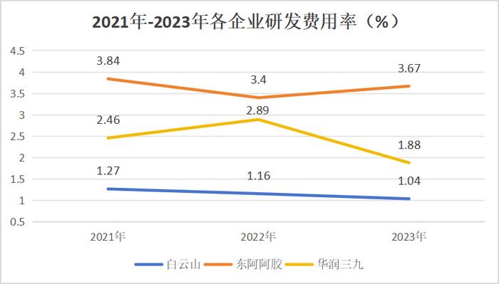 在如今市场竞争加剧的情况下,白云山研发费用却远低于同行,不仅如此,从2021年至2023年,公司的研发费用率从1.27%减少到了1.04%,研发费用率不到同为医药龙头的东阿阿胶的一半。