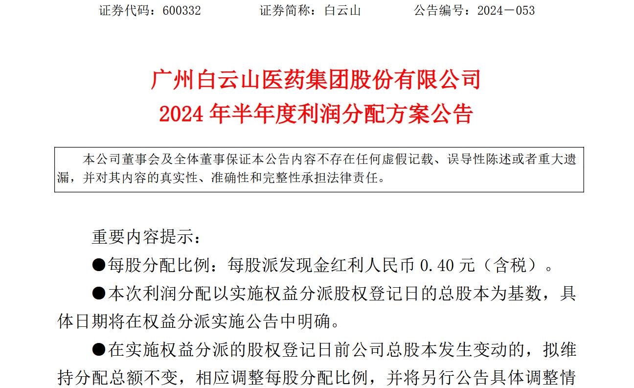 白云山在2024年半年度利润分配方案中,向全体股东每10股派发现金红利4元(含税),共计派发现金红利约6.5亿元。而在过去几年中,白云山均未直接宣布其半年度利润分配方案。