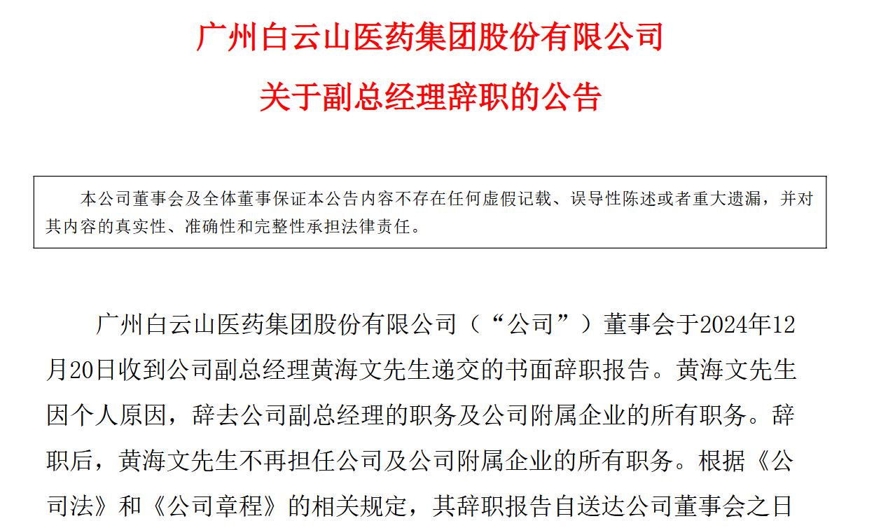 事实上,这一事件早有端倪。12月20日,白云山宣布,董事会已收到黄海文递交的书面辞职报告。黄海文因个人原因辞去公司副总经理的职务及在公司附属企业担任的所有职务,辞职后将不再担任白云山及其附属企业的任何职务。黄海文曾在白云山多个子公司担任管理层职务,并在营销管理、市场运营等方面具有多年经验。