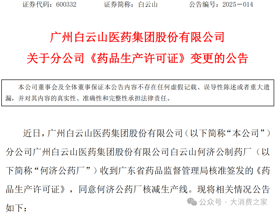 近日,广州白云山医药集团股份有限公司(600332.SH,以下简称:白云山)一则公告引发市场关注:其分公司何济公药厂因部分产能调整,核减位于广州市从化明珠工业园的一条中药前处理及提取生产线(F栋生产线)。这一看似常规的“生产线减法”,实则折射出医药行业变革期企业战略调整的多重博弈。