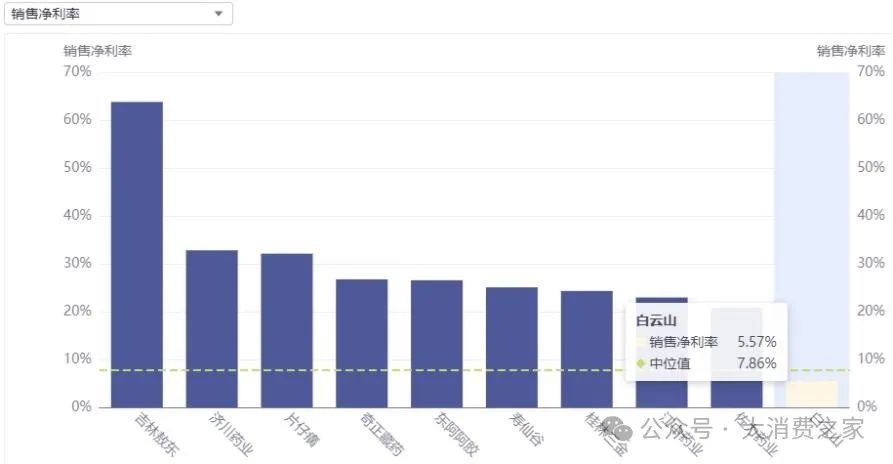 关键是公司的销售净利率仅5.57%,作为中药行业(申万行业分类三级)龙头之一,白云山数据不仅低于行业的中位值7.86%,更是远低于吉林敖东、济川药业、片仔癀等竞争对手。