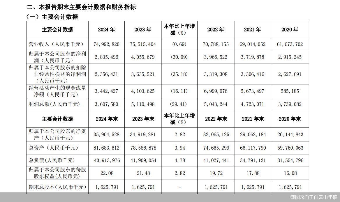 财务数据显示,2024年,白云山实现营业收入约为749.93亿元,同比下降0.69%;对应实现的归属净利润约为28.35亿元,同比下降30.09%;对应实现的扣非后净利润约为23.56亿元,同比下降35.18%。