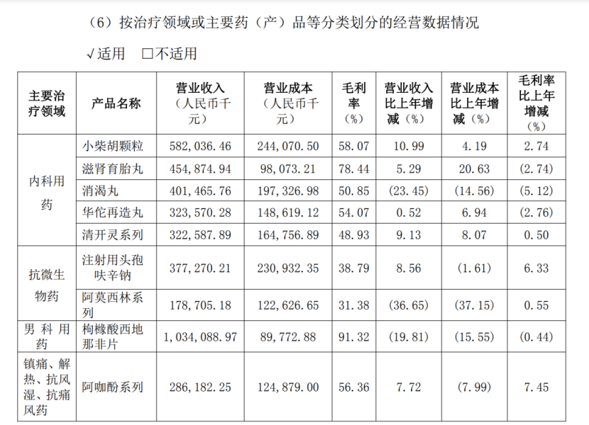中药板块虽然体量相对西药板块更大,拥有陈李济药厂、奇星药业、敬修堂药业、潘高寿药业等12家中华老字号药企,及消渴丸、小柴胡颗粒、滋肾育胎丸、板蓝根颗粒系列、华佗再造丸、脑心清片系列系列等产品。不过却缺乏像金戈这样拥有高辨识度的大单品。