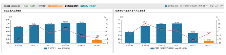 2024年,白云山交出了自2018年资产重组以来最差的成绩单:归母净利润28.35亿元,同比骤降30.09%;第四季度更是录得罕见的单季亏损3.23亿元,扣非净利润亏损高达4.99亿元。更令人忧心的是,2025年一季度颓势未止,归母净利润继续下滑6.99%至18.21亿元。