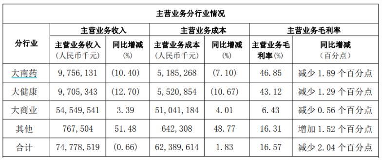 然而,该业务的毛利率仅6.43%,同比下降0.56个百分点,低于统计的医药流通行业约7%—8%的平均水平。