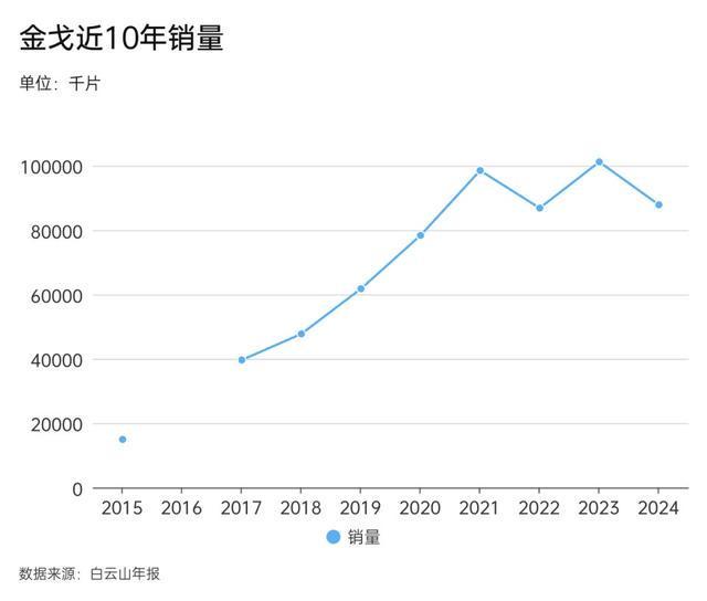 在两方压力下,2024年,金戈就已经呈现出疲软状态,去年总销量跌至10.34亿元,较历年同期下降20%。