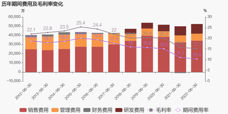 公司2022半年度营业成本42.62亿元,同比增长15.4%,高于营业收入14.6%的增速,导致毛利率下降0.6%。期间费用率为10.4%,较去年下降0.7个百分点。经营性现金流由3.24亿元下降至-5840万元,同比下降118%。