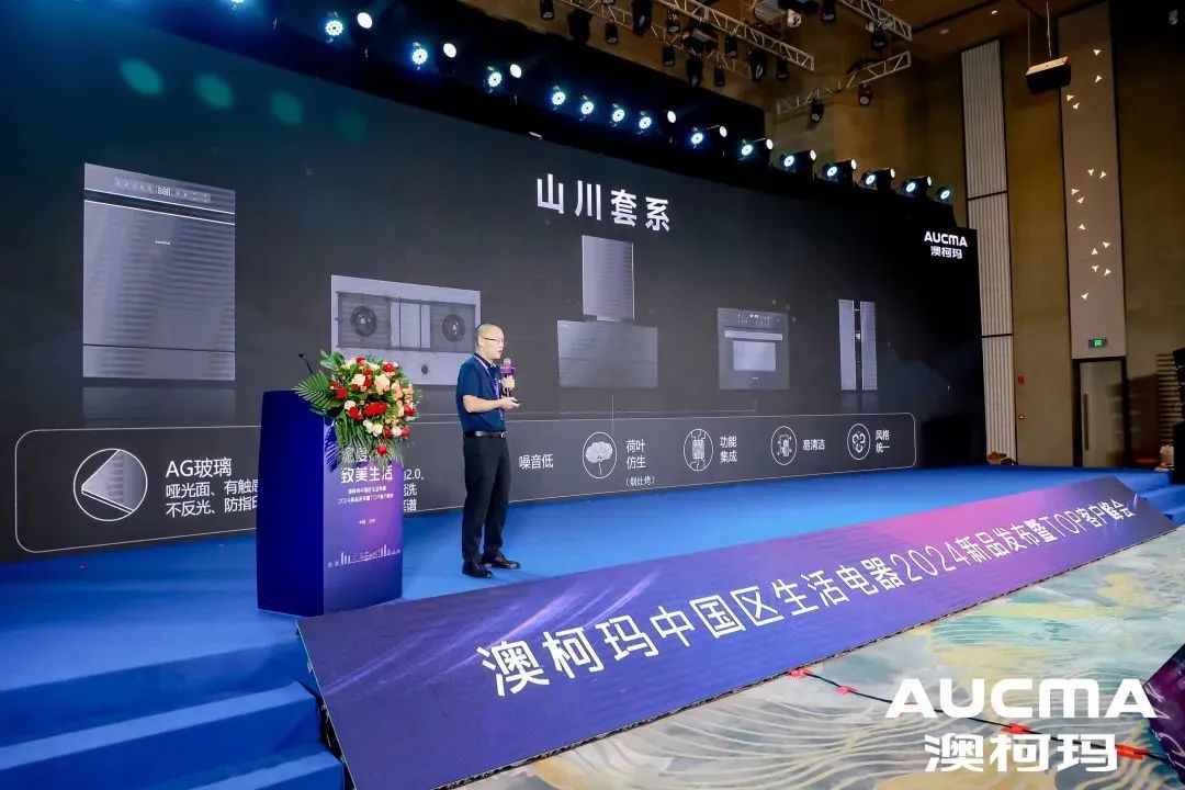 接下来,会议进入重磅的创新产品发布环节,事业部副总经理魏玉彬及其企划团队闪亮登场,分别就山川高端厨电套系以及2024年创新新品进行发布。