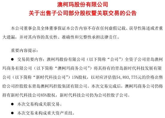 9月27日,澳柯玛发布公告称,公司全资子公司澳柯玛商务公司与青岛澳柯玛控股集团有限公司签署了《股权转让合同》,同意将其持有的新时代科技公司15%股权转让给澳柯玛控股集团,转让价格为5489.38万元。而因后者正是澳柯玛的控股股东,所以上述交易构成关联交易。