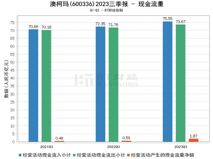 在现金流量方面,2023年三季度,澳柯玛的经营活动产生的现金流量净额为1.87亿元,较上年同期的5900.85万元增长217.29%。经营活动现金流入小计为75.55亿元,较上年同期的72.35亿元增长4.42%。经营活动现金流出小计为73.67亿元,较上年同期的71.76亿元增长2.66%。