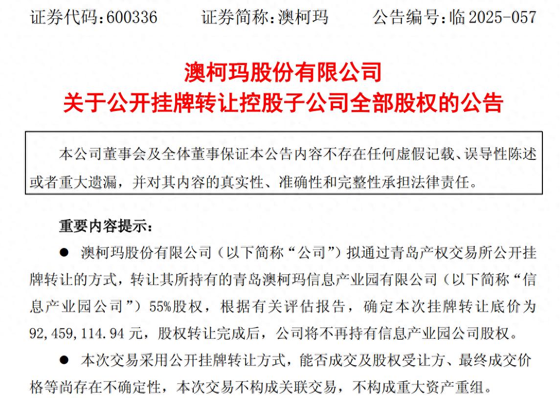 澳柯玛(600336)12月24日晚间公告,公司拟通过青岛产权交易所公开挂牌转让的方式,转让控股子公司青岛澳柯玛信息产业园有限公司(简称“信息产业园公司”)55%股权,挂牌转让底价为9245.91万元,股权转让完成后,公司将不再持有信息产业园公司股权。