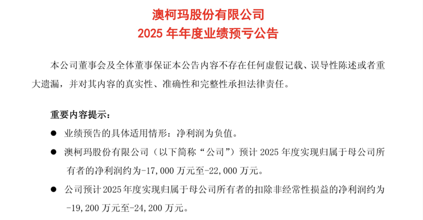 澳柯玛发布的业绩预亏公告显示,预计2025年归属于母公司所有者的净利润亏损1.7亿元至2.2亿元,上年同期亏损4852.54万元;预计归属于母公司所有者的扣除非经常性损益的净利润亏损1.92亿元至2.42亿元,上年同期亏损7588.60万元。