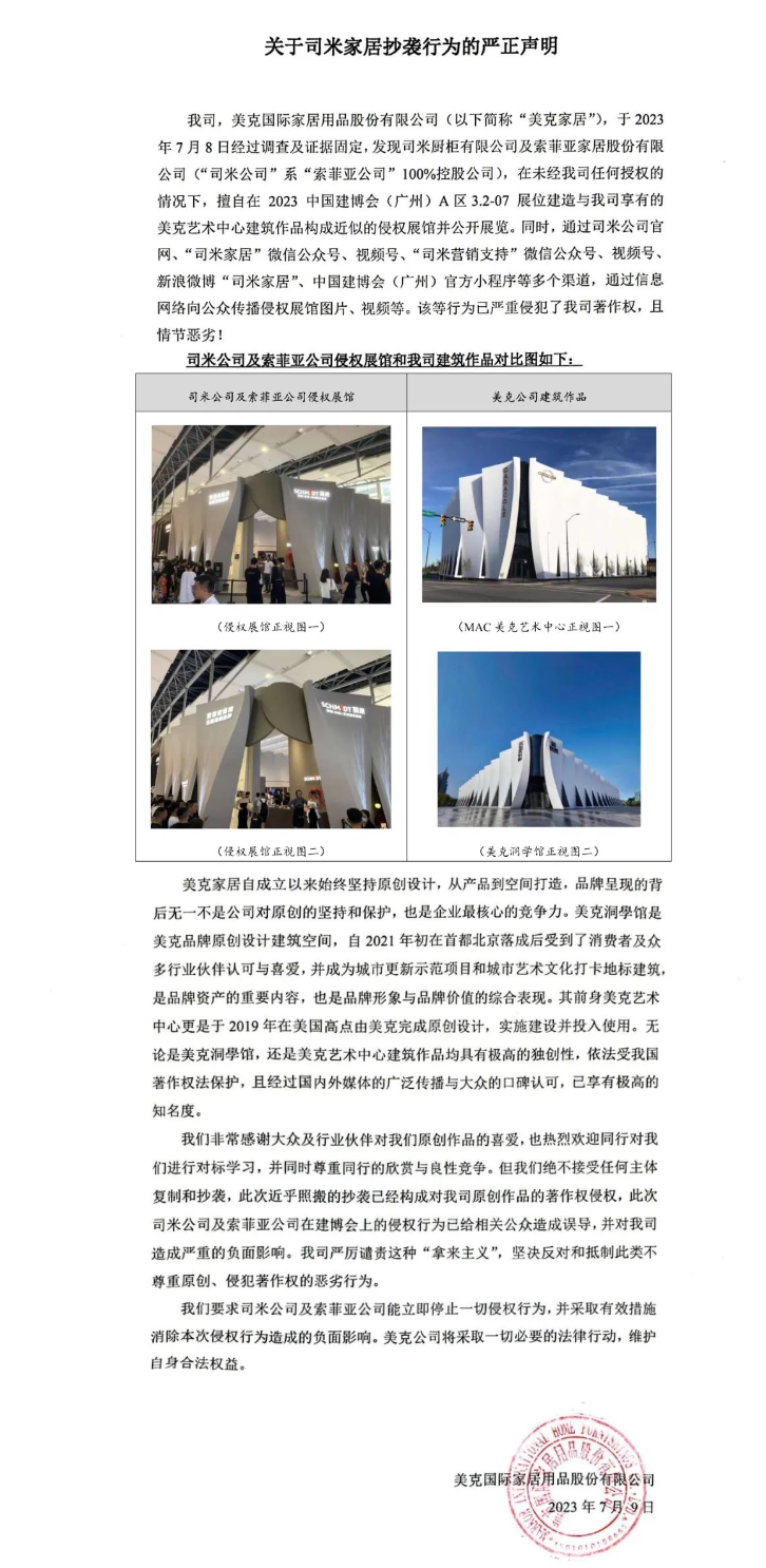 声明显示,美克家居于2023年7月8日经过调查及证据固定,发现司米厨柜有限公司及索菲亚家居股份有限公司(“司米公司”系“索菲亚公司”100%控股公司),在未经美克家居任何授权的情况下,擅自在7月8日至11日期间举办的2023中国建博会(广州)A区3.2-07展位建造与美克家居享有的美克艺术中心建筑作品构成近似的侵权展馆并公开展览。同时,司米公司官网、“司米家居”微信公众号、视频号、“司米营销支持”微信公众号、视频号、新浪微博“司米家居”、中国建博会(广州)官方小程序等多个渠道,通过信息网络向公众传播侵权展馆图片、视频等。
