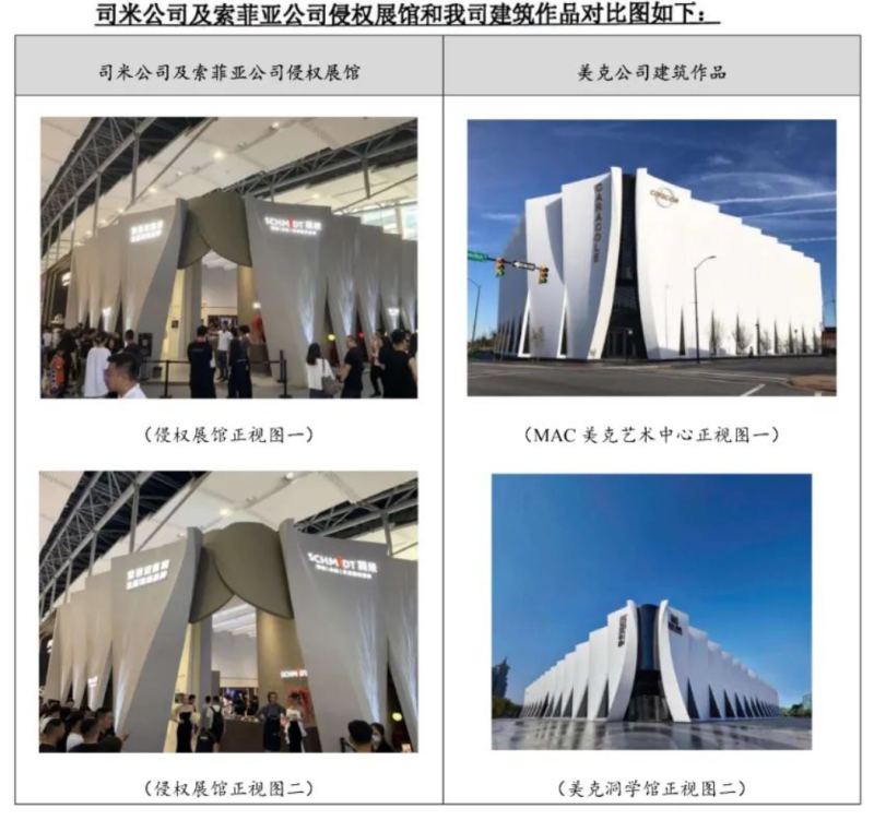 美克家居同时发布了“司米公司及索菲亚公司侵权展馆和MAC美克艺术中心及美克洞学馆”的对比图。