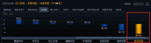 美克家居所在的成品家居行业共有16家上市公司,2023年和2024年一季度的净利润亏损的均为3家,其中,美克家居的净利润数据均排倒数第一。