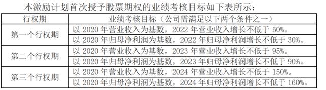 2022-2024年,对于营业收入的考核为较2020年增长幅度分别不低于50%、95%、150%。对于归母净利润的要求,较2020年增长幅度分别不低于30%、90%、160%。