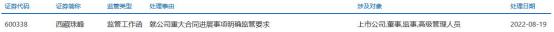 中国经济网北京8月22日讯上交所近日对西藏珠峰(600338.SH)下发监管工作函,处理事由为“就公司重大合同进展事项明确监管要求”,涉及对象为上市公司,董事,监事,高级管理人员,处理日期为8月19日。