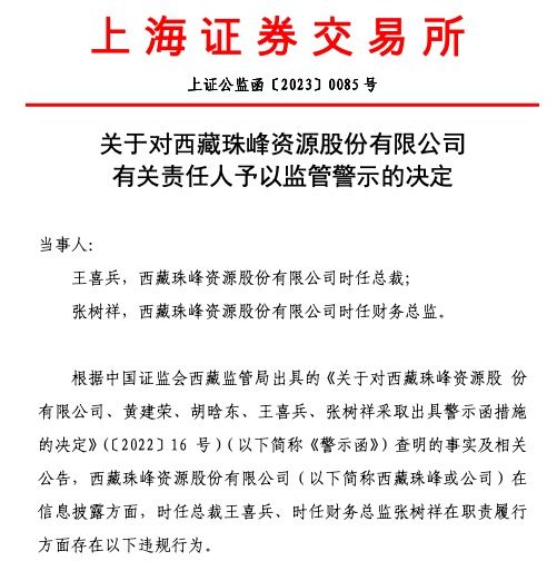 6月14日,上海证券交易所下发关于对西藏珠峰资源股份有限公司(以下简称西藏珠峰或公司)有关责任人予以监管警示的决定。决定称,因重大会计估计调整未经审议及披露、日常关联交易事项披露不完整、未及时披露法院环评禁令,对西藏珠峰时任总裁王喜兵、时任财务总监张树祥予以监管警示。