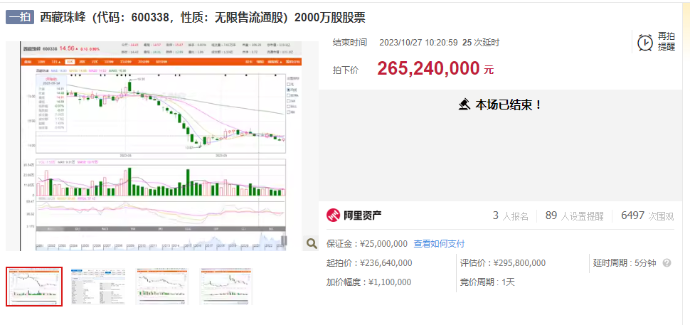 10月26日上午10时,西藏珠峰2000万股股票以2.37亿元的价格在阿里司法拍卖平台上开拍,保证金2500万元,增价幅度110万元。