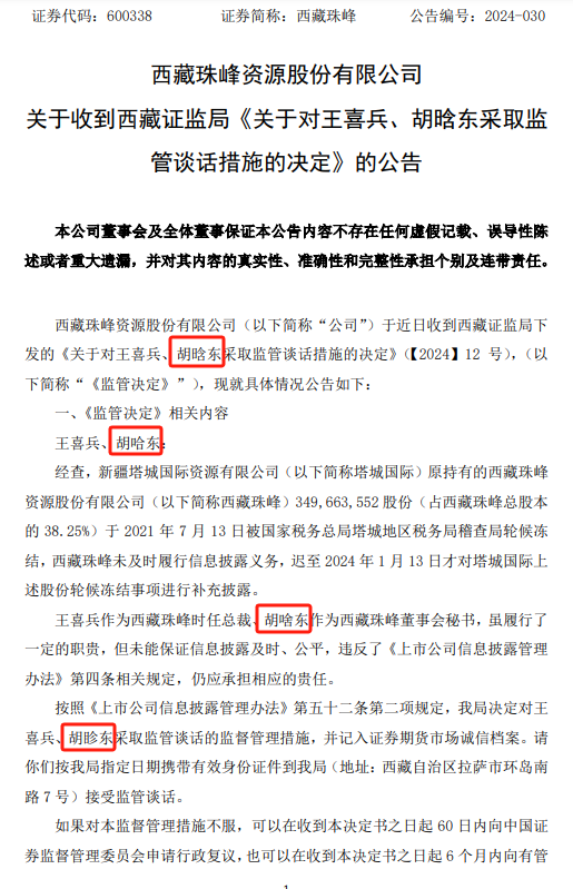 一名董秘却有4个名字?日前,西藏珠峰一则关于收到西藏证监局《关于对王喜兵、胡晗东采取监管谈话措施的决定》的公告引发关注。