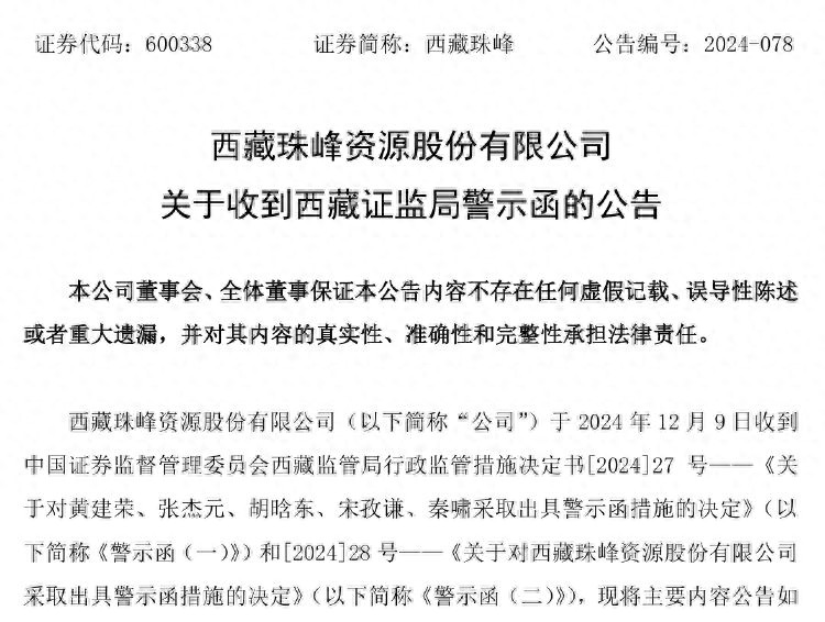 12月9日晚间,西藏珠峰(600338)公告,公司及黄建荣、张杰元、胡晗东、宋孜谦、秦啸因违规行为收到西藏证监局警示函。