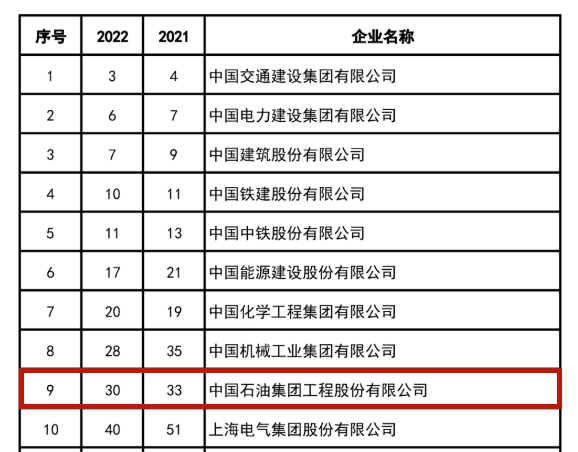 在国际承包商250强榜单中,中油工程位列第30名,较2021年的第33名上升3个位次,在上榜中国企业中位列第9。