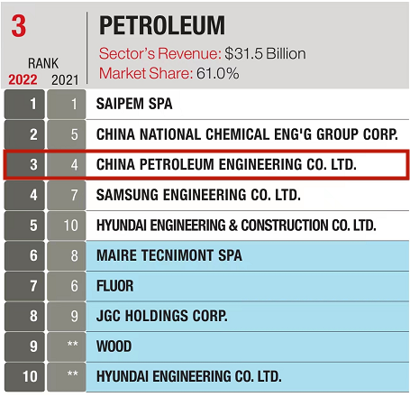 在“十大国际油气工程承包商”行业子榜单中,中油工程位列第3名,较2021年的第4名上升1个位次,仅次于意大利Saipem公司和中国化学工程公司。