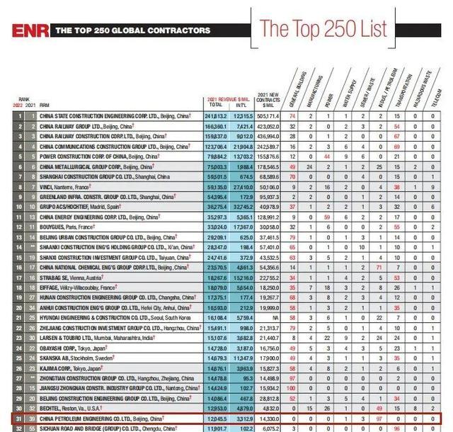 在全球承包商250强榜单中,中油工程位列第31名,较2021年的第39名上升8个位次,在上榜中国企业中排名第20。