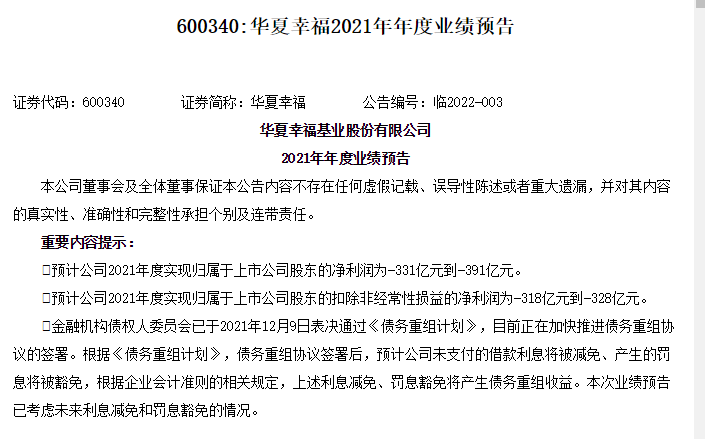 1月28日,华夏幸福提交年度业绩预亏公告称,2021年年度实现归属于上市公司股东净利润亏损331亿元到391亿元,扣除非经常性损益后净利润亏损318亿元到328亿元,同比由盈转亏,且较2021年三季报亏损金额明显扩大,主要原因是流动性风险下主业营收大幅下滑、财务费用大幅增加、应收账款及合同资产减值。
