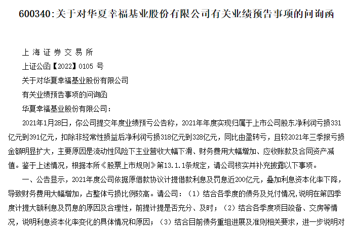 华夏幸福预告业绩当晚,上交所就下发问询函,要求华夏幸福说明在第四季度计提大额利息及罚息的原因及合理性,前提计提是否充分、及时;结合各季度项目竣备、交房等情况,说明利息资本化率变化的具体情况和原因;结合目前债务重组进展及准则相关要求。