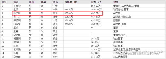 数据显示,2020年,华夏幸福四位副总裁中有三位的年薪都是437.57万元人民币,张书峰便是其中之一;不过,他的持股数并不是名列前茅的,仅有130万股。