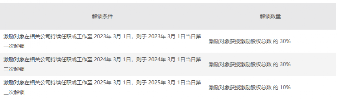 而解锁条件主要考核对公司的忠诚度,占比达到了70%,其中第一个考核期只需要到明年3月1日前没有从相关公司离职,就可以解锁30%;如果任职多一年,到2024年3月1日,则再解锁30%。而对业务实现的考核占比一共只有30%,且分三次解锁,每次权重仅有10%。