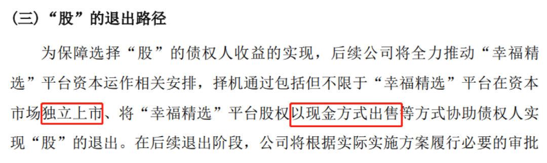 关于“股”的退出路径,公司此前曾表示,后续将全力推动“幸福精选”平台资本运作相关安排,择机通过包括但不限于“幸福精选”平台在资本市场独立上市、将“幸福精选”平台股权以现金方式出售等方式协助债权人实现“股”的退出。
