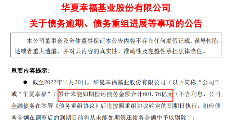 今年11月,公司及下属子公司新增未能如期偿还银行贷款、信托贷款等形式的债务金额5.8亿元(不含利息)。截至2022年11月30日,公司累计未能如期偿还债务金额合计601.76亿元(不含利息,公司金融债务在签署《债务重组协议》后将按照重组协议约定的到期日执行,相应债务金额在调整后的到期日前将从未能如期偿还债务金额中予以剔除)。