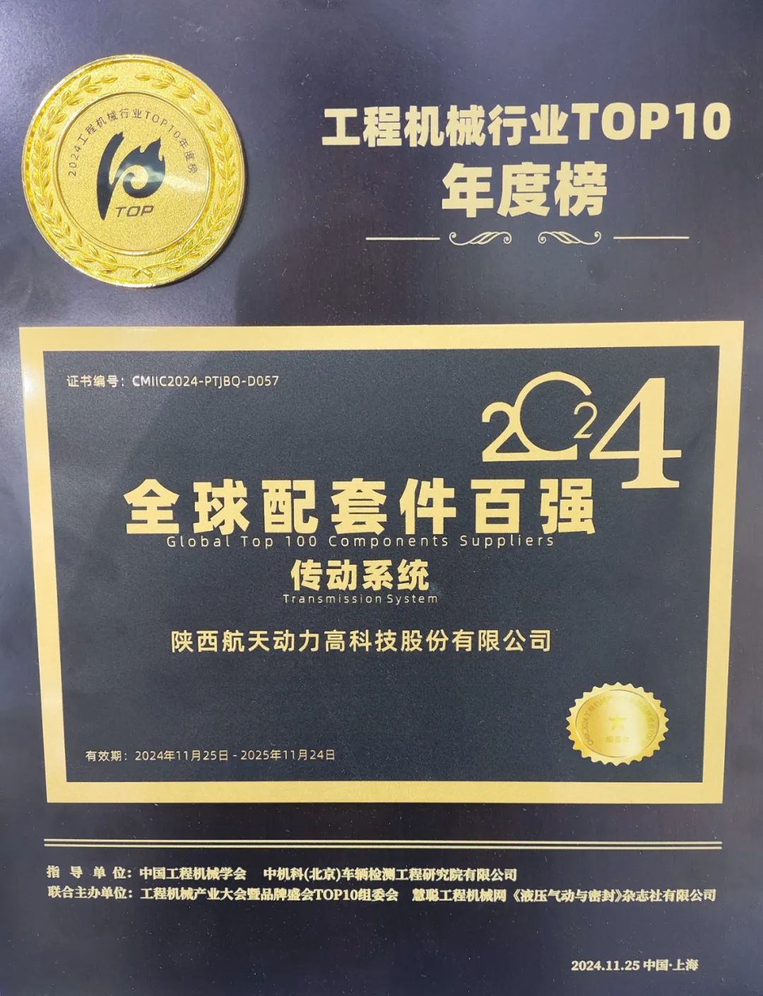 11月25日,2024工程机械产业大会在上海隆重举行。大会以“主配协同向新求质”为主题吸引众多行业同仁齐聚一堂,以更加详实、深度权威的主题分享、行业报告、高层论坛对话,共探行业破局发展的解题新思路和新路径!作为工程机械产业链的重要参与者以及主配协同发展的积极践行者,陕西航天动力高科技股份有限公司(以下简称航天动力)参加了此次盛会,并以卓越的产品实力和勇于攀登的开拓精神斩获了“2024全球配套件百强:传动系统TOP10”奖项。这一荣誉不仅是对航天动力产品在技术创新方面所取得积极成果的认可,也是对我们在工程机械领域所做出的持续且重要的贡献给予的充分肯定。