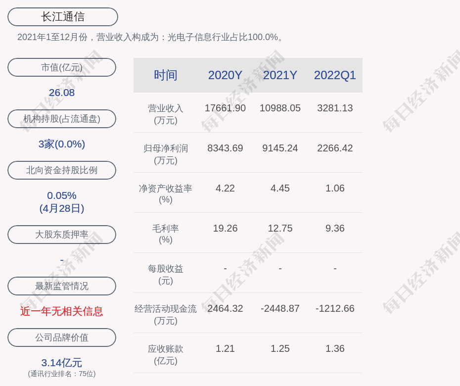 2021年1至12月份,长江通信的营业收入构成为:光电子信息行业占比100.0%。