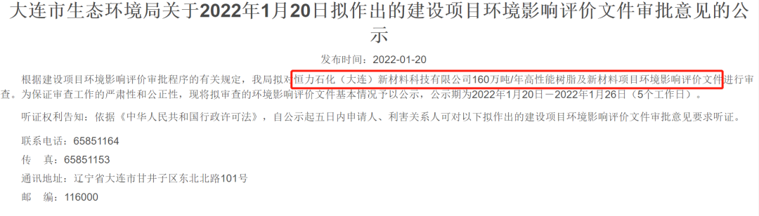 1月20日,大连市生态环境局对恒力石化(大连)新材料科技有限公司年产“160万吨/年高性能树脂及新材料项目”进行了拟批准公示。恒力石化通过恒力石化(大连)化工有限公司100%控股恒力石化(大连)新材料科技有限公司。