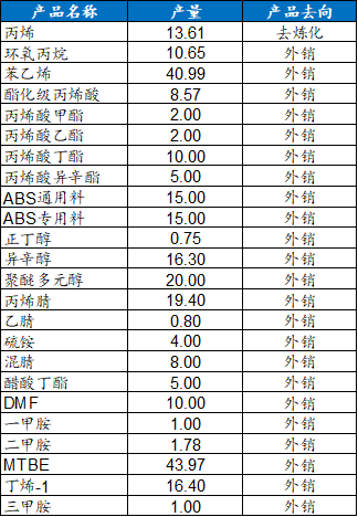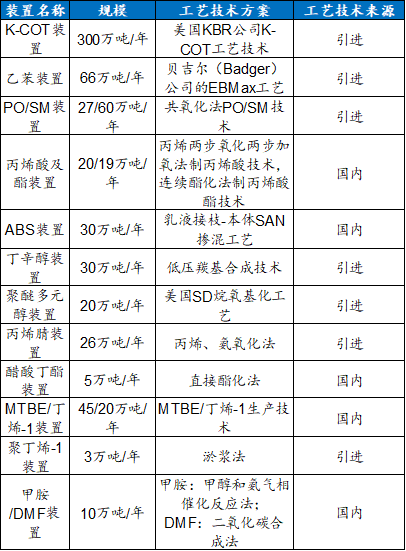 建设内容及规模:包括300万吨/年K-COT装置、66万吨/年乙苯装置、27/60万吨/年PO/SM装置、20/19万吨/年丙烯酸及酯装置、30万吨/年ABS装置、30万吨/年丁辛醇装置、20万吨/年聚醚多元醇装置、26万吨/年丙烯腈装置、5万吨/年醋酸丁酯装置、45/20万吨/年MTBE/丁烯-1装置、3万吨/年聚丁烯-1装置和10万吨/年甲胺/DMF装置共12套装置及配套公用工程和辅助设施。