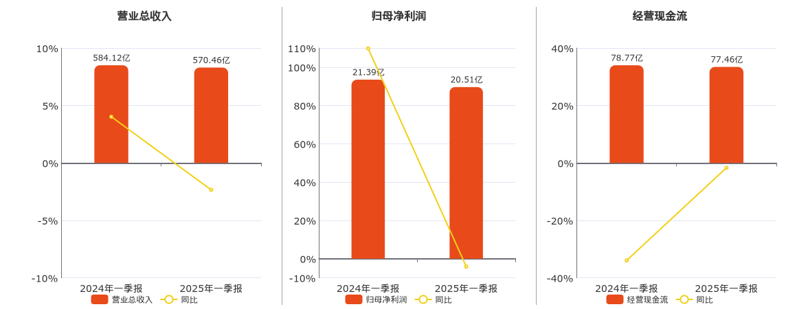 公司营业总收入为570.46亿元,较去年同报告期营业总收入减少13.66亿元,同比较去年同期下降2.34%。归母净利润为20.51亿元,较去年同报告期归母净利润减少8843.34万元,同比较去年同期下降4.13%。经营活动现金净流入为77.46亿元,较去年同报告期经营活动现金净流入减少1.31亿元,同比较去年同期下降1.67%。